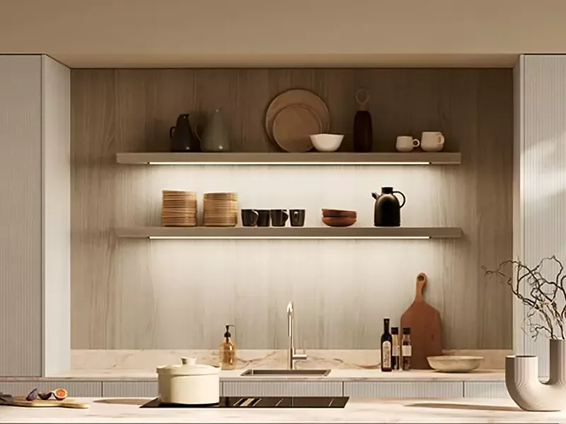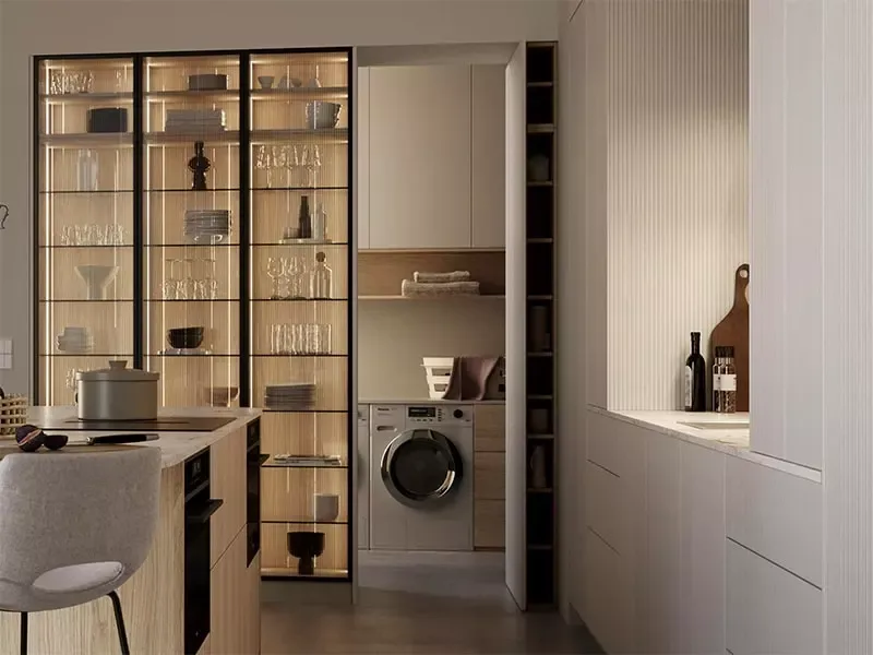 Le verre structuré Fluted Glass sublime l’ensemble en apportant une touche de transparence et de légèreté. Utilisé sur certaines façades, il permet d’entrevoir le contenu des armoires tout en préservant une sensation d’ordre et de sophistication.