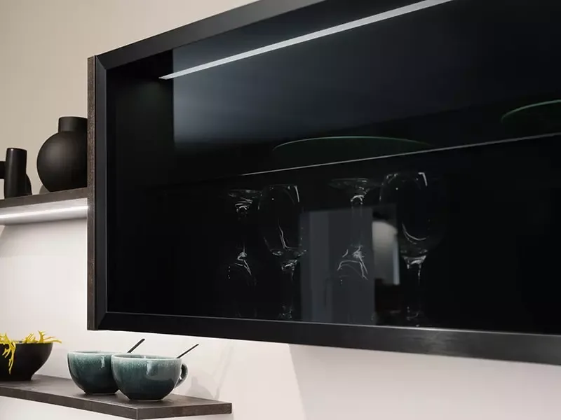 La façade Brown Steel en mélaminé structuré donne le ton : une teinte foncée, presque métallique, qui évoque les matériaux bruts de l’univers industriel. Cette finition texturée capte la lumière de manière subtile, renforçant la profondeur des volumes. Les vitrines en verre noir et les étagères assorties complètent la palette avec cohérence. L’ensemble crée une ambiance à la fois affirmée et élégante, sans excès.