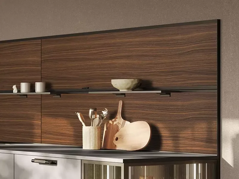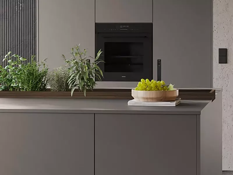 La cuisine Umbra se distingue par ses lignes sobres et son ambiance chaleureuse. Les façades en mélaminé mat des couleurs Umbra et Clay Dark sont dotées d’une technologie anti-traces de doigts, garantissant une propreté impeccable au quotidien. L’îlot central en configuration « L » intègre une cloison astucieuse qui offre des solutions de rangement supplémentaires tout en structurant l’espace. Une vitrine ajoute une touche de raffinement en mélangeant les textures, tandis que les poignées design apportent une finition discrète mais contemporaine.