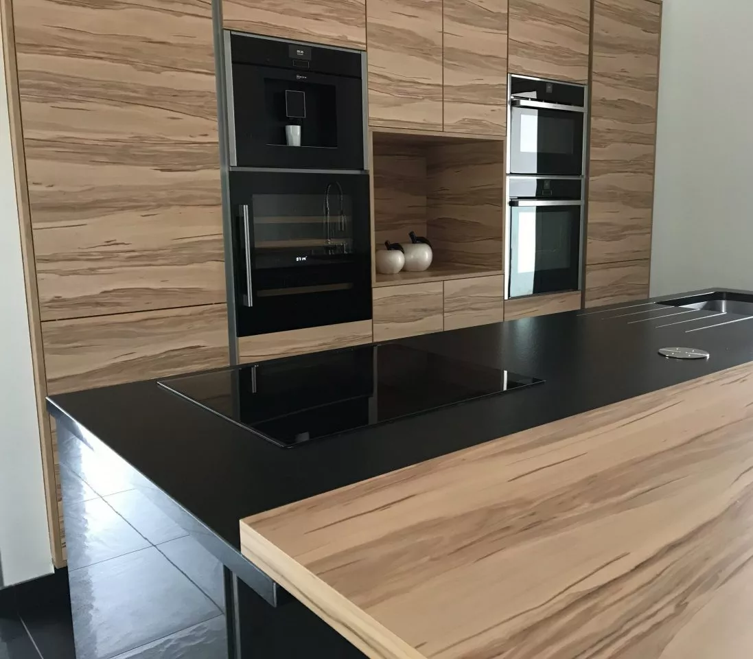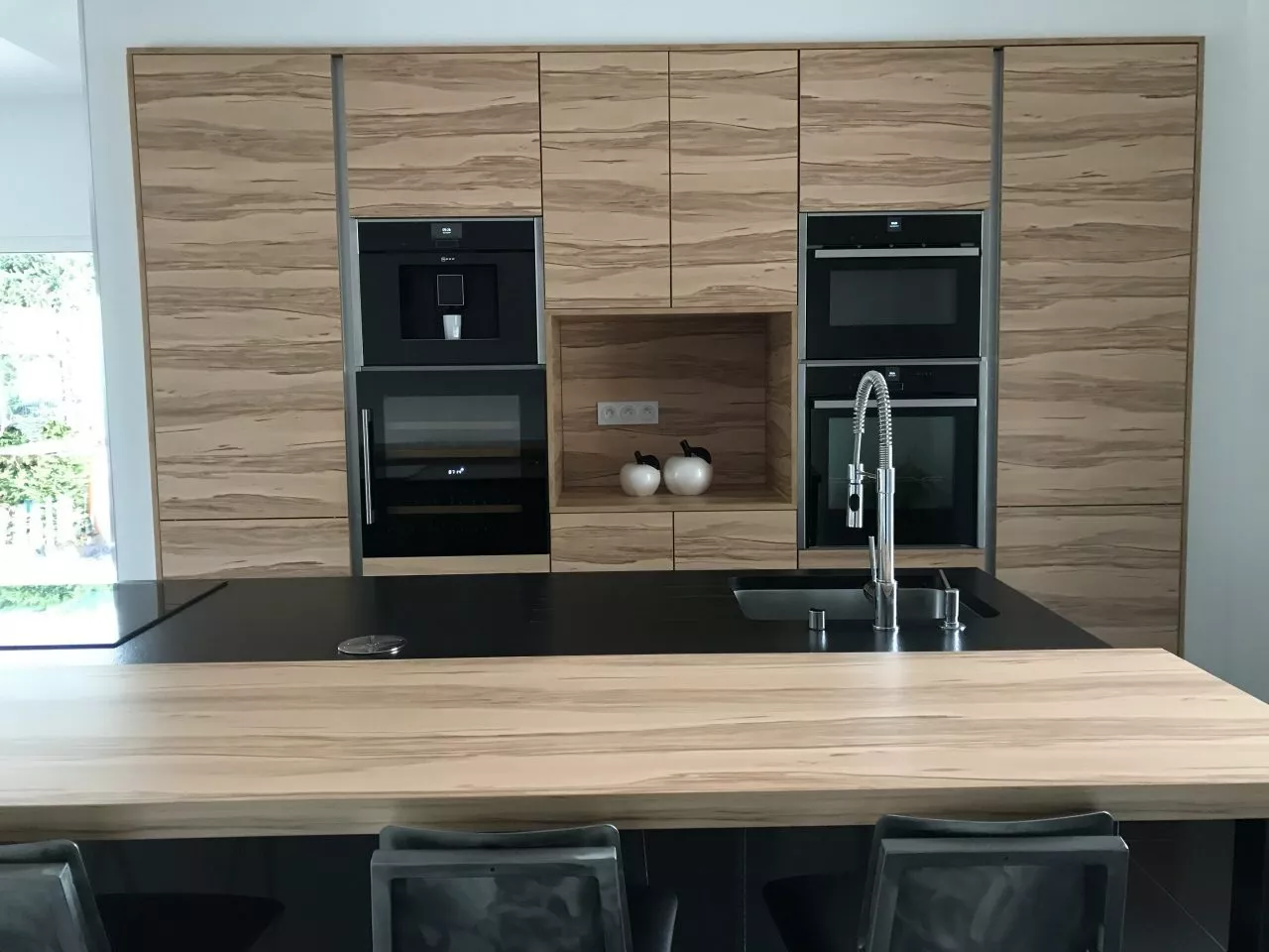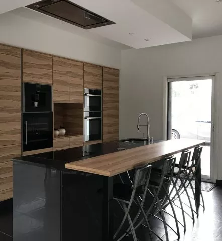 « Pour cette réalisation, nous avons travaillé l’alignement des veines du décor bois sur l’ensemble du bloc armoire. C’est ce qu’on appelle la continuité du veinage. C’est un détail technique souvent négligé dans la grande distribution, mais qui fait toute la différence sur le rendu final ‘haut de gamme’ d’une cuisine de cuisiniste. »