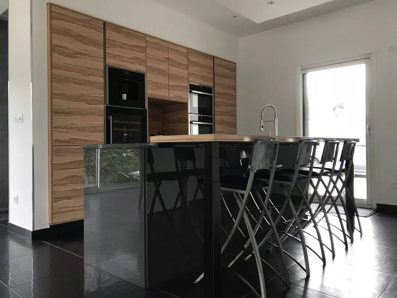 Dans cette réalisation, le bloc armoire et le plan bar sont habillés d’un stratifié qui imite à s’y méprendre le bois de rose. L’illusion ne s’arrête pas au regard : au toucher, le veinage est structuré, offrant une sensation de matière bluffante.