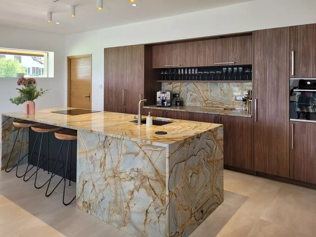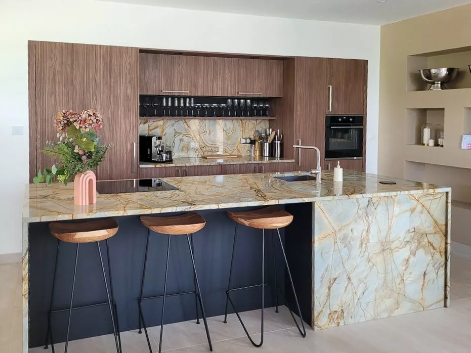 - Le détail « Waouh » : Le plan de travail en Granit Emperator aux veines expressives.