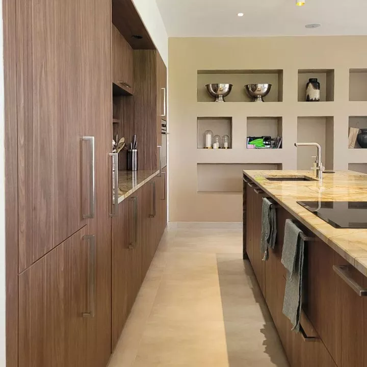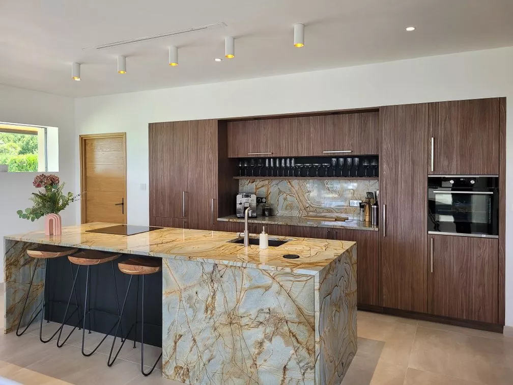 2. La structure : Il délimite visuellement la zone cuisine de la pièce de vie sans cloisonner, respectant l’architecture ouverte de la villa.