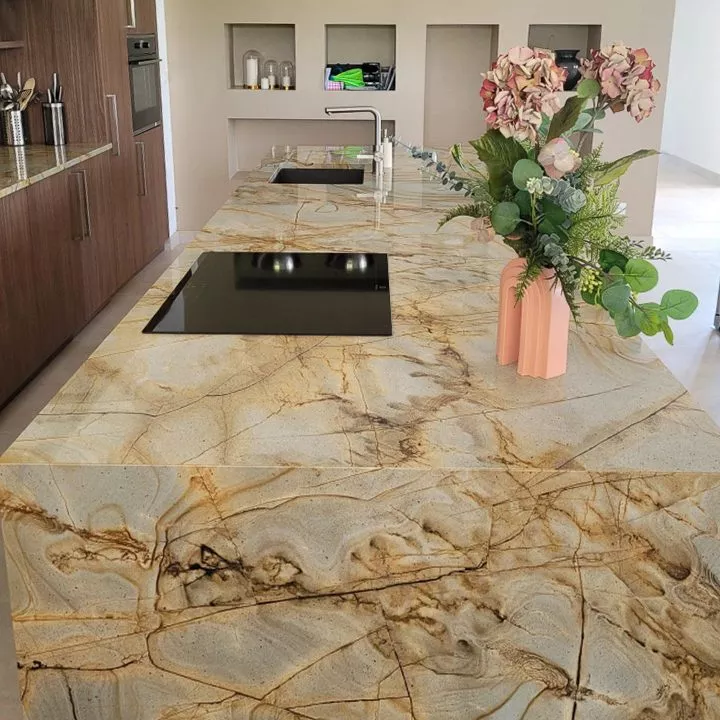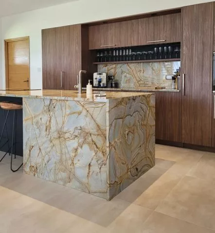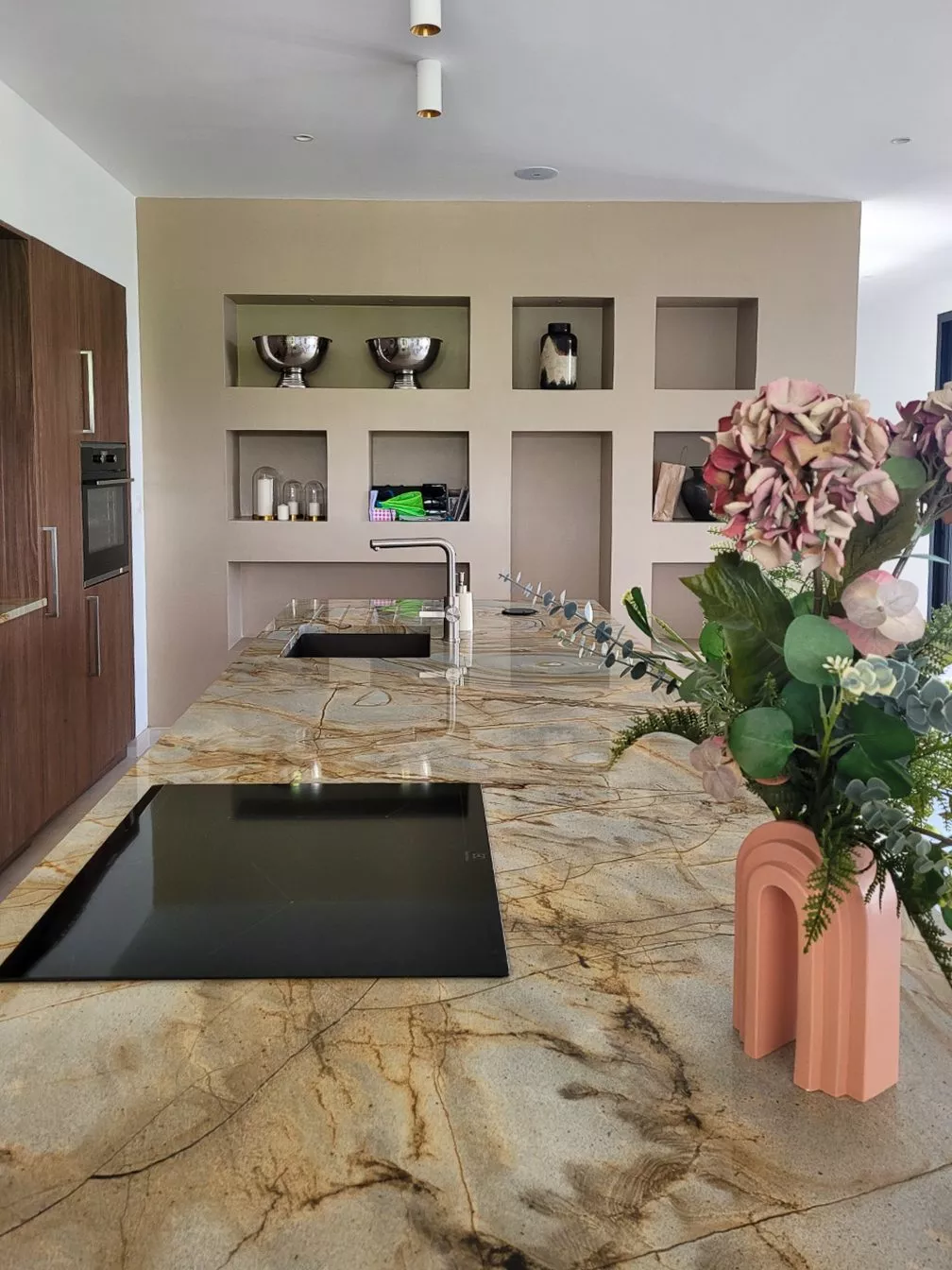 • Impact Visuel : Ce granit apporte une dimension minérale puissante qui contraste avec la luminosité de la pièce.