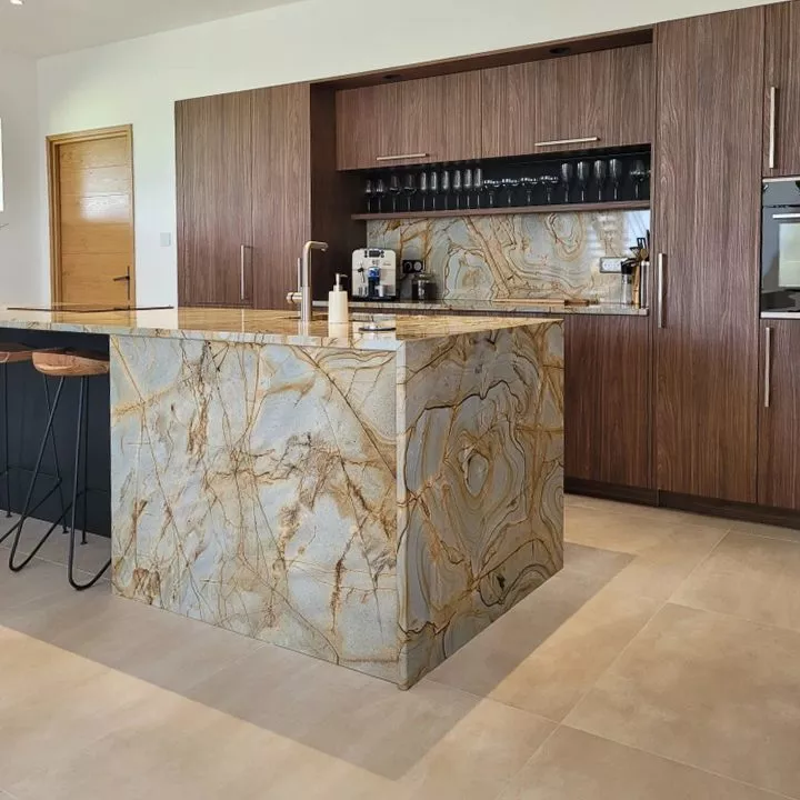 Le choix du matériau a été déterminant. Ils ont sélectionné un Granit Emperator, une pierre naturelle rare aux veines marquées et aux nuances profondes.