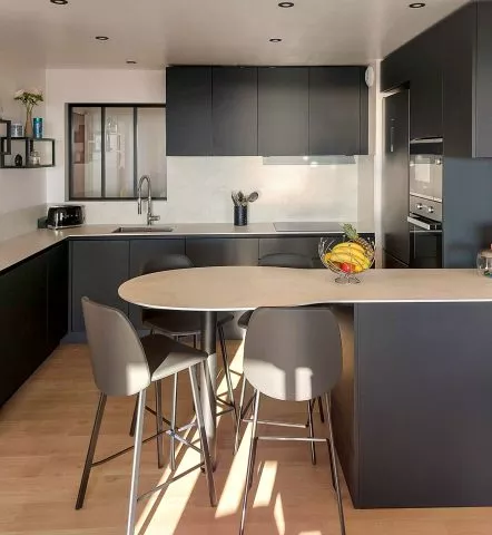 Associé à une gorge sans poignée noire, il renforce la continuité des lignes et donne à la cuisine un aspect homogène, sans rupture visuelle.