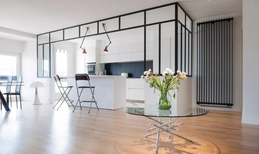 Derrière son esthétique soignée, cette cuisine cache une organisation millimétrée avec ses rangements en hauteur et ses niches ouvertes pour valoriser objets déco et livres de cuisine. Les colonnes dissimulent électroménagers et réserve alimentaire, assurant une cuisine aussi fluide que fonctionnelle.