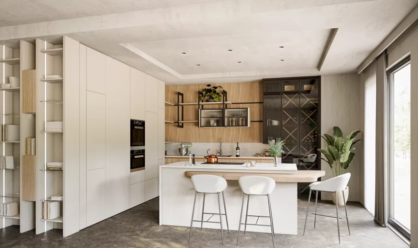 Véritable pièce maîtresse de l’aménagement, l’îlot central joue la carte de la générosité. Sa forme légèrement ovale adoucit les lignes de la cuisine et favorise la circulation. Les rainures verticales de la façade renforcent son aspect design, tout en créant un jeu de lumière subtil.