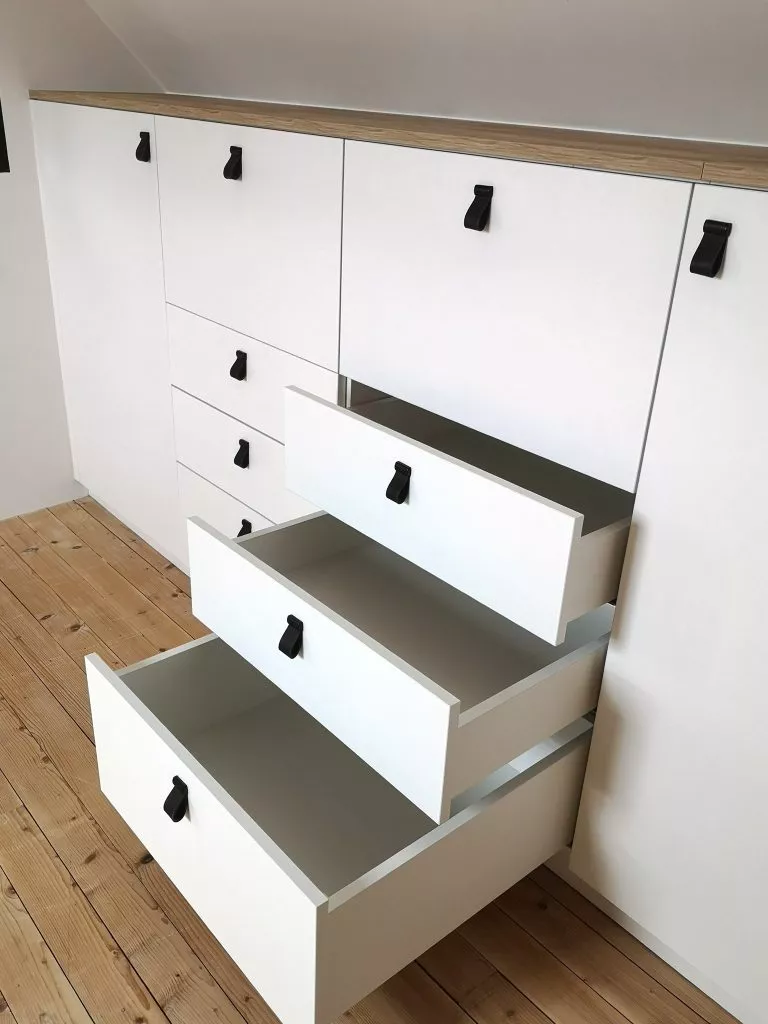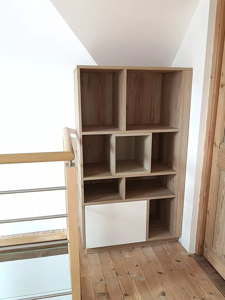 L’autre atout majeur de cette réalisation réside dans le mobilier sur mesure conçu spécifiquement pour les sous-pentes.
