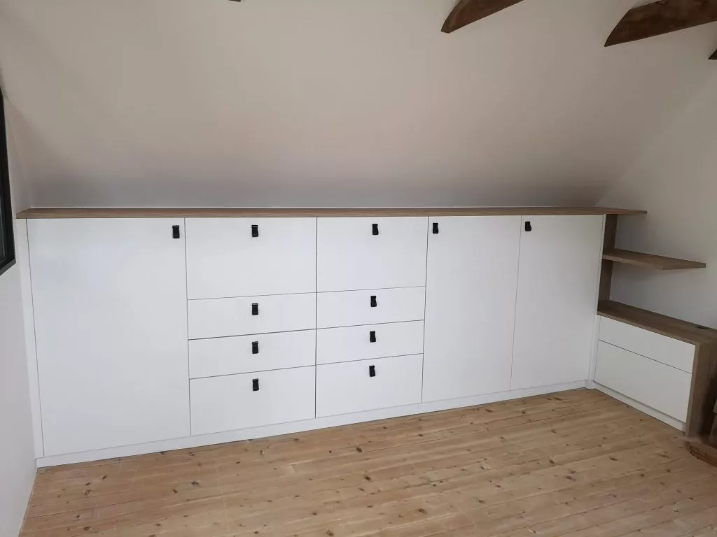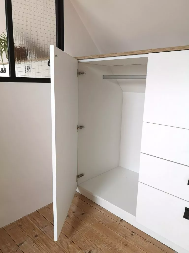 Ce projet illustre parfaitement cette démarche : un espace sous combles transformé en suite fonctionnelle, où chaque meuble répond à une utilité précise, sans jamais sacrifier l’esthétique.