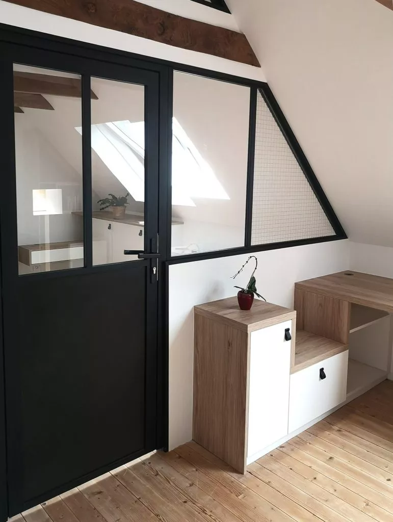 Pièce maîtresse de cet aménagement de mezzanine sur mesure, la verrière noire marque la transition entre les espaces sans alourdir l’ensemble.